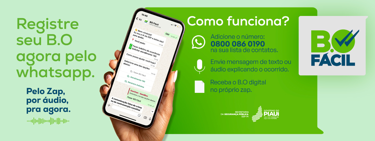 O B.O Fácil contabiliza mais de 36 mil atendimentos registrados no Piauí desde seu lançamento, no final de junho. A plataforma inovadora é fruto de uma parceria entre a Secretaria de Segurança Pública do Piauí (SSP-PI) e a Universidade Federal do Piauí (UFPI). O sistema permite que cidadãos solicitem o registro de ocorrências diretamente pelo WhatsApp, sem a necessidade de deslocamento até uma delegacia.